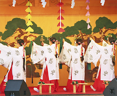 多くの人の目を留めたのが中学生から大学生までの巫女さんによる「浦安の舞」=写真。「浦安」とは「心の安らか」という意味で平和を祈る心の舞のことで、かつて古く「浦安の国」とされ風土が美しく平和だった日本の国名を想い、全国各地で奉納されてきた。本来は神前でのみ行われる神聖な神事だったが明治以降、一般の前でも披露されるようになったという。同神社では4年前の竣工祭からの恒例となった。