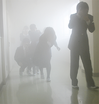 普段見慣れた廊下に煙が充満すると、まったく前が見えず、生徒たちは指示通りにハンカチを口元に当て、姿勢を低くしながら避難して行った。