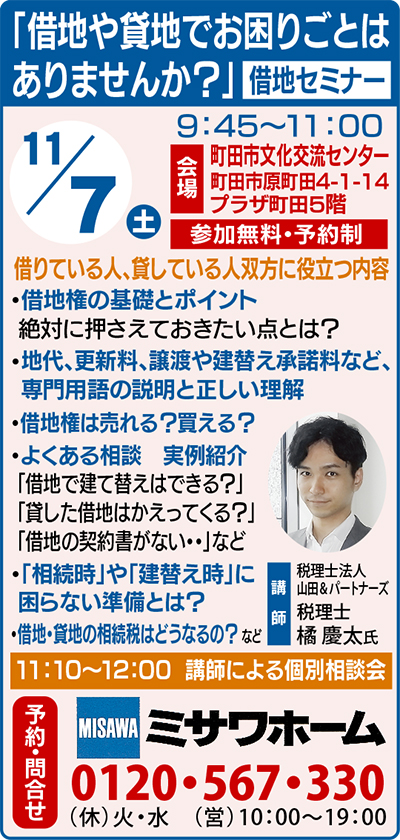 セミナーでは税理士の橘氏が借地や貸地の基礎やポイント、注意点をやさしく解説するほか、実際のトラブル事例やその解決方法を多数紹介。借地や貸地の相続税の計算方法なども分かりやすく解説する。参加無料。申込みは電話で気軽に。