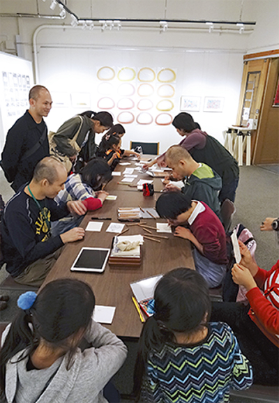 「LaMano」(ラ・まの)は障がいのある人のアート活動を支援する場所として金井ではじまり今年で10年目。アトリエで生まれたアート作品を東京、神奈川、埼玉など様々な美術館やギャラリーで展示発表をしてきた。今回の展覧会ではその活動10年を記念し、地元町田で開催。10月25日にはワークショップ「ポストカードを作ろう」が開かれ(写真)、利用者が作ったオリジナルの塗り絵を地域の子どもが塗るなどして交流。LaManoの担当者は「こういった機会も少ない。多くの方に参加していただいて、同じ空間でアート活動ができてよかったと思います」と話していた。(問)LaMano【電話】042・736・1455