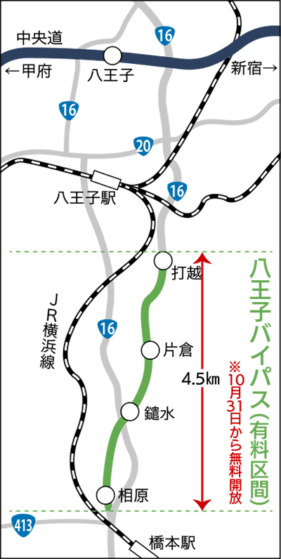 八王子バイパスが30年の料金徴収期間を終了し、10月31日(土)から有料区間が無料となる。無料となるのは相原IC(町田街道)付近から打越IC(北野街道)付近までの4・5キロ。これにより、並行して走る国道16号線の渋滞緩和にも期待がかかる。