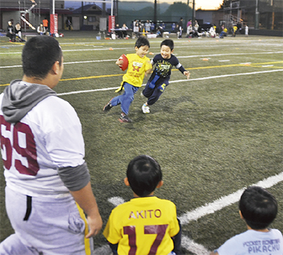 同大アメフト部主催の「フラッグフットボールクラブ」は昨年5月に発足。現在年少から小6までの約35人の正会員と体験者が参加している。