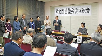 地域コミュニティづくりの取り組みとして市が10カ所の設立を推奨する「地区協議会」が新たに南地区で設立した。今月1日には南市民センターで同会設立総会が開かれ(写真)、市民が今後に向け結束を深めた。地区協議会はこれで9例目。