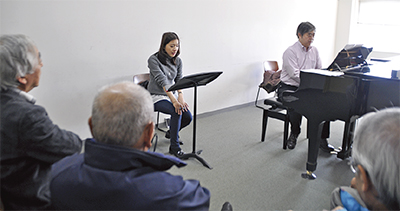歌は松岡教授の元教え子で、現在はプロとして活躍、また声楽の講師でもある岡村実和子さんが担当。打ち合わせが行われた19日には町内会の人々の前で、演奏に合わせて歌唱を披露。住民の喝さいを浴びた。