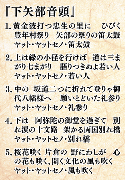 町内会に残っていた文献から、下矢部音頭を作詞したとされる「八木健吉」氏は同町内会の総務を担当する八木滋さん(65)の叔父にあたる。八木さんは「叔父は俳句や郷土史を書いていた。作詞したのも頷ける」と話す。詩の中には地名のほか「七曲り」や「片倉」など当時地域で使われていた名称が記されている。