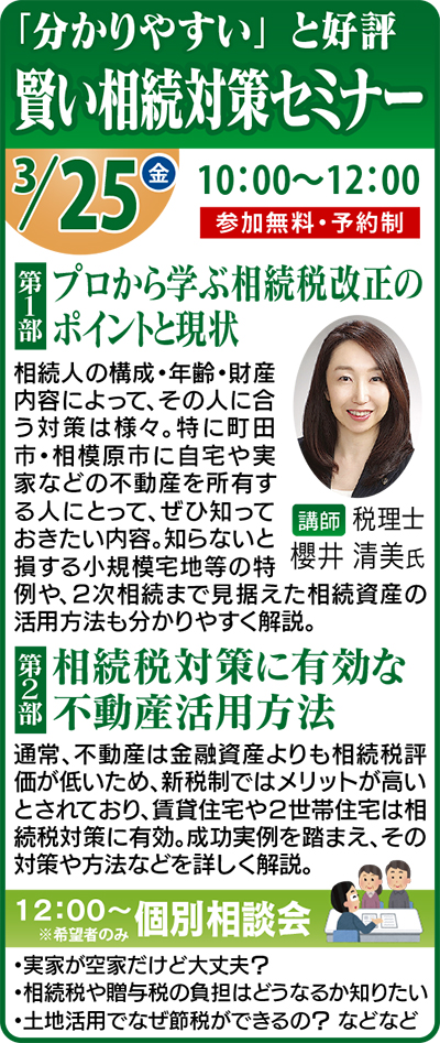 第1部では税理士の櫻井氏が相続税改正のポイント等を分かりやすく解説する。特に町田市・相模原市エリアに自宅などの不動産を所有する人にとって、ぜひ知っておきたい内容。