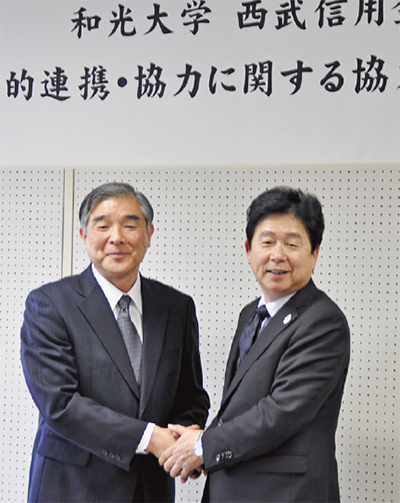 和光大学(金井町・伊東達夫学長)はこのほど、西武信用金庫(中野区・落合寛司理事長)と「地域の活性化と産業の振興を図るため相互に協力し、地域社会の発展に寄与すること」を目的に、包括的連携・協力に関する協定を結んだ。24日には同大学長室に両者が揃い、協定書への署名、交換を行った。同大が金融機関と協定を結ぶのは初めて。