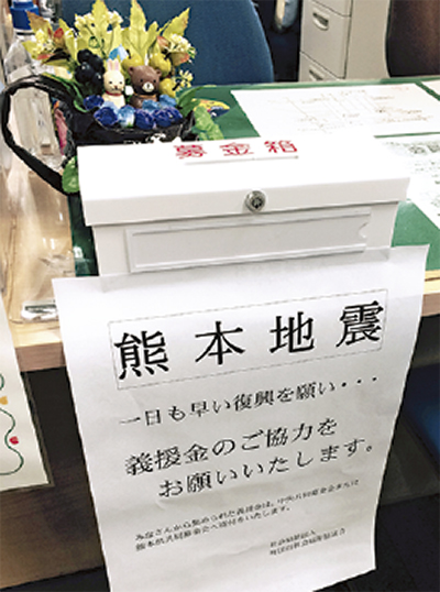 ○社協=町田市民フォーラム4階の町田市社会福祉協議会では、同会事務所受付カウンターに募金箱を設置し(=写真下)、支援を呼びかけている。義援金は中央共同募金会か熊本県共同募金会へ寄付される。