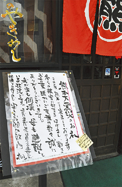 町田駅前の熊本ラーメン店「火の国(改)」店主の大田黒順司さんは、熊本市にある実家が今回の地震で被災した。「母親は無事に避難したと連絡が来たけど、家は倒壊してしまった」。一人で店を切り盛りしながら「居ても立っても居られないという思い、母やみんなの顔を見に行きたいという思いはあるが、経験してきた中で、やみくもに向かうのは妥当ではないと判断した」と話す。