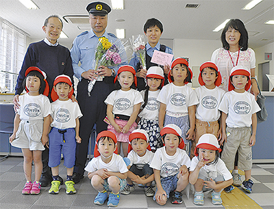 桜美林幼稚園「はと組」の園児11人が3日、忠生地区交番を訪れ、地域を守ってくれている「お巡りさん」に感謝の気持ちを込めた花束を贈った。