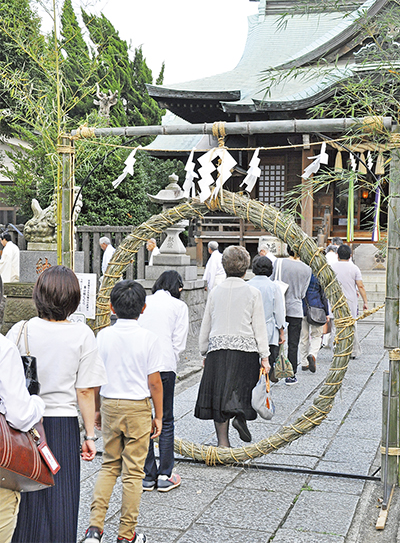 参拝者らは、参道に設けられた茅の輪を左回り、右回り、左回りと3回、8の字を描くようにくぐり、自身の半年間の罪と穢れを落し、これからの健康や幸福を祈った。