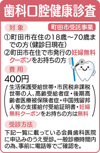 健診内容は問診、むし歯・歯周疾患等の診査、歯列・かみ合わせ、義歯の清掃等の状況検査、予防指導など。「生涯を通じておいしく安全に食べ、会話を楽しむことは、健康で豊かな人生を送るために重要。歯科口腔健康診査をきっかけに、ご自分の歯を大切にし、何でも食べられる楽しい生活をおくりましょう」。問合せは同会事務局【電話】042・726・8018へ。