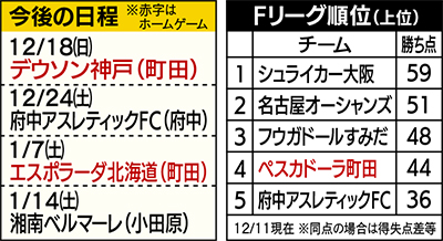 これで14勝2分8敗、勝ち点は1つ伸ばして44に。Fリーグは4位をキープ。