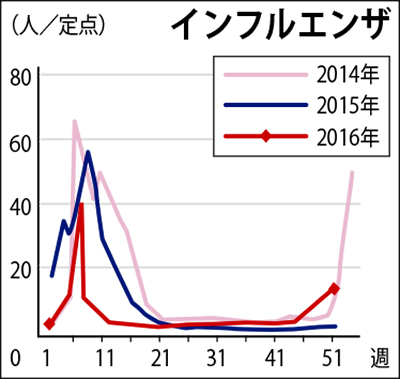 町田市内では、インフルエンザ患者報告数が2016年第49週(12月5日〜211日)で、市内13カ所の定点医療機関で、先週(54人)から74人に増えるなど流行の兆しを見せている。 市内小学校でも10日までに10クラスが、今週に入ってさらに4カ所の学級閉鎖が報告されている。