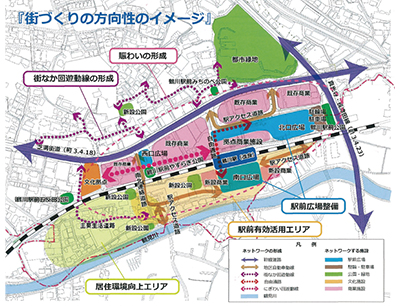 方針は【1】安全で便利な交通機関の強化、【2】快適で賑わいのある駅前空間の創出、【3】駅周辺の住環境の向上を掲げ、各方針の具体的事例として、【1】について「北口広場の改良、南口広場の新設、駅アクセス道路の整備」「自由通路の整備、駅舎改良」、【2】について「新たな商業施設の誘導による駅前空間の魅力向上」「南北まちづくりの推進」「駅周辺施設の連携による賑わいの形成」、【3】は「駅周辺をネットワークする街なか回遊動線の形成」「主要生活道路の整備による防災性の向上」「駅前立地を生かした住環境の形成」などを明示している。