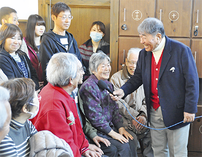 高齢者相手に「じじい」、「ばばあ」と歯に衣着せぬ毒舌トークが人気の毒蝮三太夫さんが14日、現在市内で2軒だけの銭湯のひとつ、大蔵湯(土田太一店主)に登場。その姿を一目見ようと集まった常連客や近隣住民、毒蝮さんのファンらが、拍手と歓声で毒蝮さんを歓迎した。