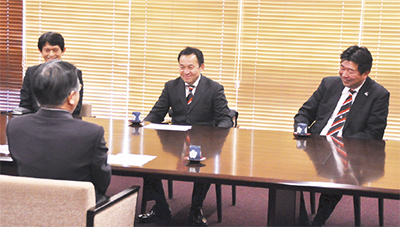 町田市のホームタウンチームで、ラグビートップリーグに所属する「キヤノンイーグルス」。今期16チーム中7位だった同チームは3月1日、石阪丈一町田市長のもとを訪れ、2016―2017シーズンの終了報告を行った。