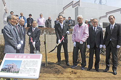 町田さくらまつりが行われた町田市立総合体育館で25日、国の天然記念物「三春滝桜」の子孫樹の植樹式が行われた。2011年以降、同まつりで被災地の物産販売などの協力を継続したことに対して、感謝の気持ちとして福島県三春町から寄贈されたもの。