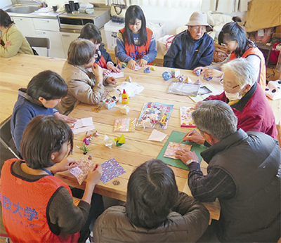 避難所となっていた町の体育館で、段ボールハウス、パーテーションの片付けや、子どもたちの世話をした。その活動を通して、地震で怖い思いをした子どもたちからは『ふれあい』が求められていると感じた。「歳も近い分、甘えてくれた。家が倒壊し、両親ともに勤めに出なくてはならないという家庭も多く、放課後や休みの間は何もすることができない。仮設暮らしで狭苦しい思いもしています。私たちは、建物を建て直すなどのハード面ではなく、ソフト面で役立てると感じました」と話す。現地の大学やNPOと連携し、集会所での映画鑑賞会や食事会などを企画している。