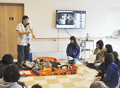 研修会には学生20人が参加。意識障害や心停止などの救命処置の仕方とともに、AEDや災害用ベスト、布タンカの設置場所や使い方を学んだ。看護師長の井一(いのいち)伸子さんは「学生が共生する意義がここにある」とコメントした。