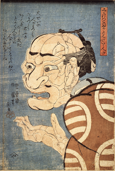 それから長いこと滑稽を創る仕事に携わってきた水泡は面白いと思った話のメモや漫画の切り抜きを集めながら、その整理をするためには滑稽がどんな構造で組み立てられているか調べてみたいと思うようになりました。研究は一冊の本にまとまり、「滑稽の構造」(1981、講談社)として実を結びました。また、日本滑稽史の発生を探ろうとすすめた研究は「滑稽の研究」(1987、講談社)となって世に出されました。その後、滑稽研究の素材にもなった「軽筆鳥羽車」をはじめとする鳥羽絵・木版漫画本類、歌川國芳・小林清親・河鍋暁斎らの戯画・風刺画、鯰絵、子供遊絵、岡本一平の似顔絵類などのコレクションは町田市立博物館へと寄贈されました。本展では、田河水泡の足跡と研究をたどりながら水泡の愛した滑稽画コレクションについてご紹介いたします。