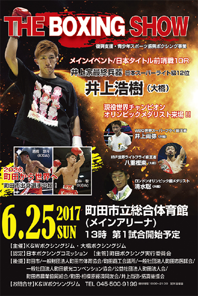 メーンイベントには”井上家最終兵器”と呼ばれる日本スーパーライト級8位の井上浩樹(=人物風土記で紹介)の日本タイトル前哨戦10Rを実施。予定していた町田出身選手2人はけがのため欠場することになったが、現役世界チャンピオン2人、WBO世界スーパーフライ級王者の井上尚弥、IBF世界ライトフライ級王者の八重樫東とロンドンオリンピック銅メダリストの清水聡(いずれも大橋ボクシングジム所属)が来場して盛り上げる。