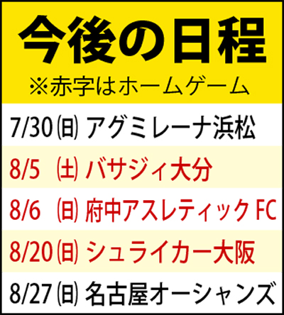 次節は30日(日)、アウェーでのアグミレーナ浜松戦。午後8時キックオフ。次のホーム戦は第9節、8月5日(土)のバサジィ大分戦。