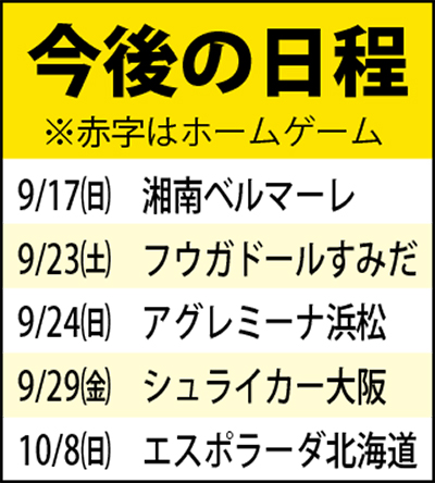 次節の第16節は17日(日)、小田原アリーナで湘南ベルマーレと対戦。午後4時キックオフ。次のホーム戦は10月15日(日)、町田市立総合体育館での府中アスレティックFC戦。