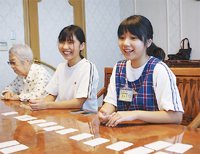 芝田栞伶杏(かれあ)さん=写真右、塚越美結(みゆう)さん=同中央=の2人は第一希望でここを選んだ。9月11日からの5日間、仕事を見て、業務を手伝い、入居者との交流を楽しんだ。オリエンテーションでは認知症の人は何度も同じことを繰り返すけど、その都度初めて聞いたようにふるまってほしいと教わった。「将来は医療系の仕事に就きたい」と芝田さん。一方の塚越さんは吹奏楽部に在籍し、演奏会で来所した縁のある場所だ。イベント企画室で百人一首の会に参加した2人は「毎日が楽しい。ずっとここにいたい」と笑顔を見せた。入居者からも「元気をもらえた」と感謝の言葉をかけられた。