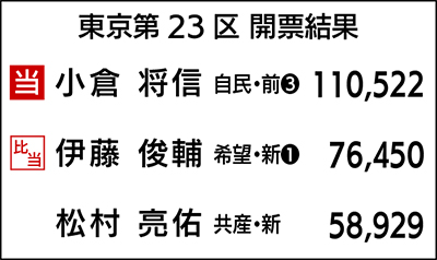 第48回衆議院議員選挙が22日、投開票され、町田市を選挙区とする東京23区(多摩市の一部含む)は自民党前職の小倉将信氏が小選挙区で当選し3期目を果たした。希望の党から出馬した伊藤俊輔氏は重複立候補した比例で復活し、初当選した。