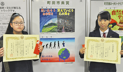 「市長賞」小学生の部は、「過去と現代の対比が見事に表されている」と評された蛭田七海さん(町田六小5年)が受賞。「びっくり」と受賞の感想を述べた。中学生の部で市長賞の小川翔和さん(町田二中2年)は「きれいな現代を取り戻すイメージで描きました」と話し、「受賞は嬉しい」と喜んでいた。そのほか、「会長賞」小学生の部に早田陽さん(大蔵小4年)、中学生の部に豊田詩乃さん(町田三中2年)が、「審査員長賞」小学生の部に梶田真由さん(木曽境川小5年)、中学生の部は川嶋萌さん(町田二中2年)が選ばれ、それぞれ表彰を受けた。