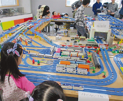 「ボランティアのお兄さんたちが作る超ロングなプラレールです。電車の持ち込みもOKです」と同センター。持ち込む電車には必ず記名を。