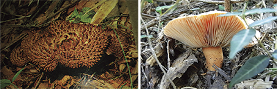 先週、何気なく見ていたバラエティー番組で「静岡のタケノコ王と山梨のキノコ名人が幻のキノコを探す」という企画を放送していた。キノコが大好物の私には有り難い企画だったが、番組終盤で明らかにされた幻のキノコの名は「コウタケ」(写真左、山渓カラー名鑑「日本のきのこ」より)だった。その瞬間、治りかけの腰がくだけた。というのも、若かりし頃、知人の伝手で初めて長野県へ夏松茸を採りに出かけた折、急峻なマツタケ山に登る途中でたくさん収穫したのがコウタケだったし、長野の地元民はそれほど珍しいキノコとは位置付けていなかったからだ。同じ大きさでも秋の松茸より実が詰まっていて倍近く重い夏松茸の方が遥かに上位にあるようだった。その番組では収穫したコウタケを炊き込みご飯などにして堪能して終わるという流れで、ついにコウタケの性質について語られることはなかった。これは危うい。