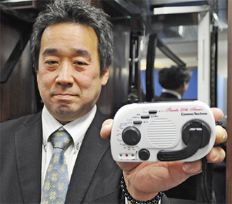 「阪神淡路大震災の発生から23年、新たな防災意識の喚起につながるようにとの思いを込めました。備えることで被害を軽減できるものと思います。防災ラジオの商品価値を体感していただくとともに、ご自宅の防災対策を見直すきっかけになれば」と同社営業部部長の中川訓さん。