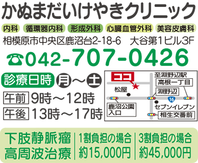 かぬまだいけやきクリニック(淵野辺十字路そば)では、専門に「足のむくみ外来」を設置。より気軽に受診しやすい環境づくりを整えることで、同疾患の早期発見・治療に努めている。