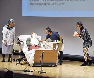 有識者による講演とともに行われた寸劇「一郎さん脳梗塞で倒れる」では、実際に市内で活動している医療・介護事業所の有志が実演した。一組の高齢者夫婦に降りかかった脳梗塞発症という悲劇をもとに、医療ソーシャルワーカーやケアマネ、訪問看護など在宅療養を応援する医療・介護チームの存在や役割などをわかりやすく紹介。本人やその家族がどうすべきかを学ぶ機会となった。観覧者は出演者の素人らしからぬ熱演と、素人らしいたどたどしさに、笑いと感心の声を上げていた。