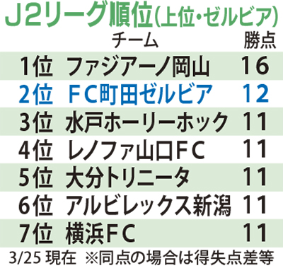 負けないゼルビア、開幕から6戦を終え、いまだ黒星なしの3勝3分-勝点も12に伸ばし単独2位に浮上した。1位のファジアーノ岡山とは勝点差4だ。