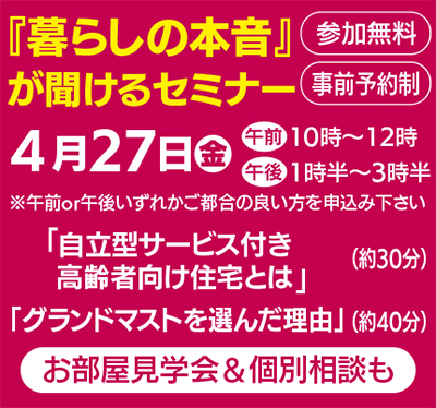 「種類が有り過ぎて違いが分からない」「住んでみてからイメージと違ったとなるのが嫌」等々、これからの住まいで迷っている方は多いはず。高齢者住宅について”知りたい本当のこと”を現場担当者が教えてくれるセミナーが4月27日(金)、「グランドマスト横浜鴨居」で開催される。