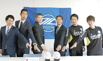 「スポーツメイト」部門で競技と仕事を両立したい人をサポートする体制を整えるパソナ。所属選手の雇用先の確保が課題の一つとなっているゼルビアレディースにとっては、大きな力となるパートナーシップだ。締結式にはパソナからの3人をはじめ、ゼルビアレディースの守屋実事務局長、新しく就任した奥山拓也監督、原歩コーチ(=人物風土記で紹介)も出席。モデルケースの一つになることも期待される。