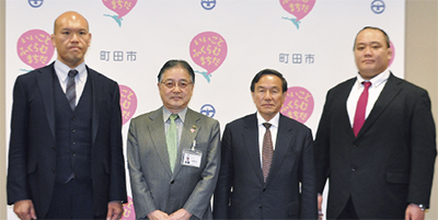 大相撲地方巡業「町田場所」が4月20日(金)、町田市立総合体育館で開催されるのに先立ち、13日町田市出身の小野川親方(山響部屋/元北太樹)などが石阪丈一町田市長のもとを訪れた。