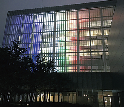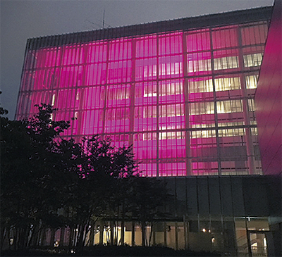 赤、青、黄、緑、黒の五輪カラーやピンクなどの鮮やかな色が建物を彩る――市庁舎アトリウムに屋内設置型のライトアップ用照明を設置し、現在実施中の定時退庁日(水・金曜)の午後6時30分〜9時(2時間半)に点灯させる。市庁舎西側のアトリウムガラス面が2020年まで五色のオリンピックカラーを中心に、9月の世界アルツハイマーデーに向けた認知症施策推進(オレンジ)、10月のピンクリボン運動(ピンク)などの啓発の際には色を合わせて点灯する。