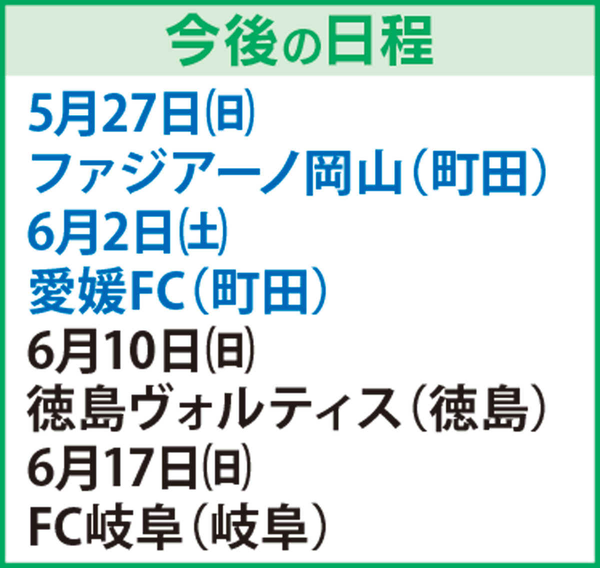 次節は5月27日(日)、ホームの町田市立陸上競技場にファジアーノ岡山を迎える。午後4時キックオフ。この試合は玉川大学マッチデーとして行われる。スタンドを青く染めて、ゼルビア戦士を一緒に応援しよう。ホーム戦のチケットは市内の郵便局で購入できる。