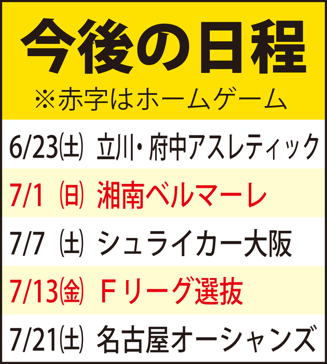 次節は23日(土)、アリーナ立川立飛での立川・府中アスレティックFC戦。午後4時から。次のホーム戦は7月1日(日)、湘南ベルマーレとの『境川決戦』。午後7時開始。スタンドを黄色く染め、昨季ホーム無敗の記録更新を後押ししよう。チケットはペスカ【電話】042・710・5890へ。