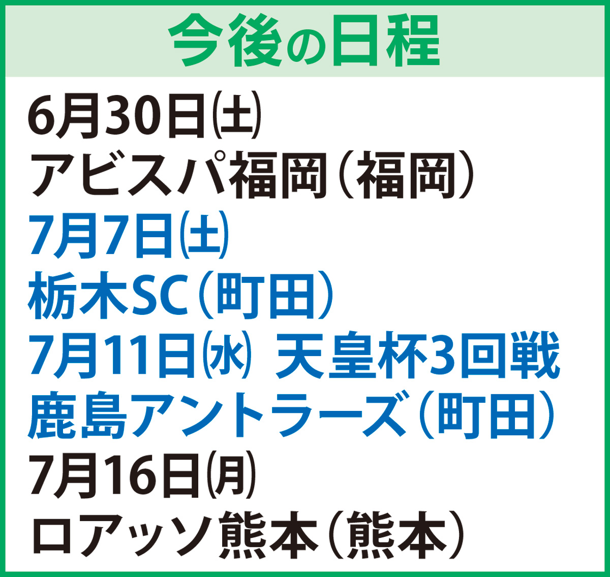 次節は6月30日(土)、アウェーのアビスパ福岡戦。結果次第で順位が入れ替わる。次のホームは7月7日(土)の栃木SC戦。午後6時キックオフ。七夕の夜を「天空の城」野津田スタジアムで迎えよう。