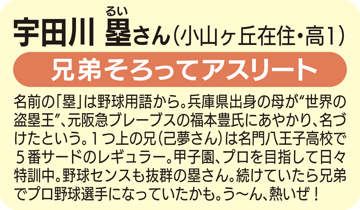 「海外に行きたい」。小6時代、兄の背中を追ってやっていた野球を辞め、留学を志願。英語も分からないのに、その生活が肌に合った。そして感じた世界の風―。帰国後、小山中陸上部で名を馳せると、中3でトップアスリート発掘育成事業に合格。世界に飛び立つ足掛りができた。そこで出会った自転車競技。「陸上は都大会止まり。自転車なら全国、五輪を目指せる!」。強豪・八王子桑志高校に進み、5月の男子ジュニアケイリンで見事1位。4Km速度競争も関東大会出場を決めるなど、早速頭角を現す。チームスプリントでは補欠ながらインターハイメンバーに名を連ねた。自転車通学に部活、家でもローラーの上で自転車を漕ぐ毎日。町田の新星が、日本の新星になる日も遠くない。