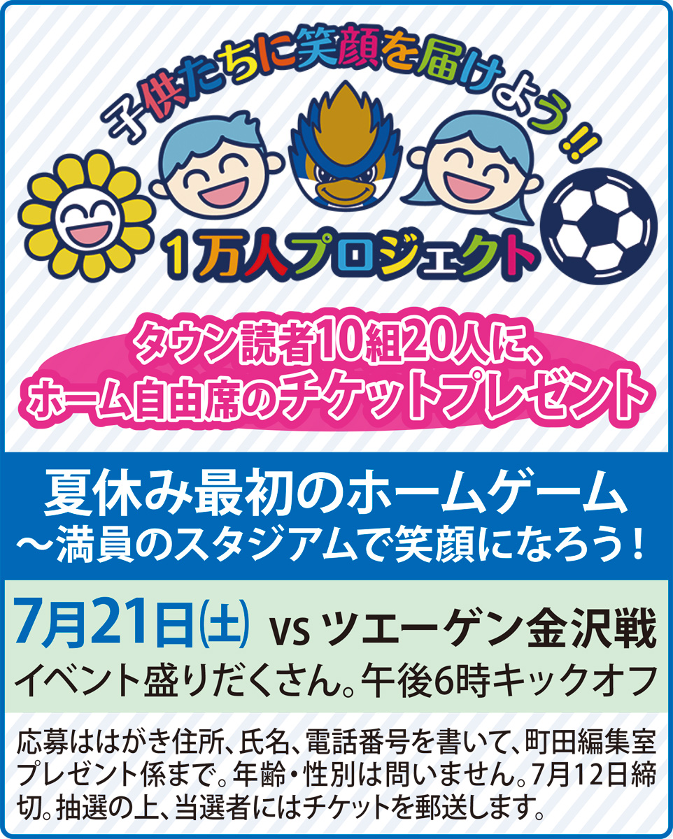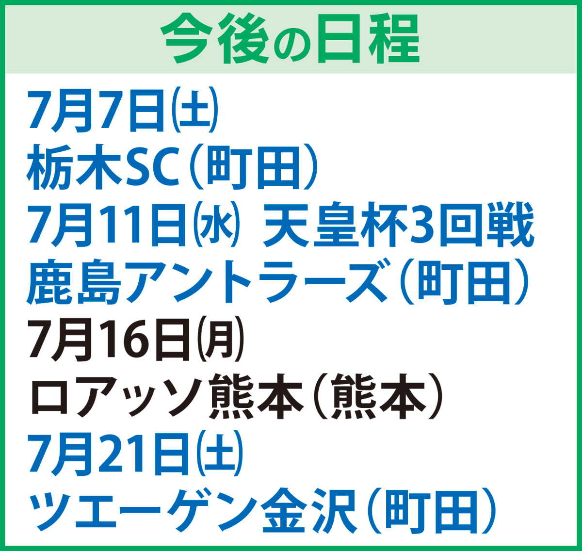 次節はホームの町田市立陸上競技場で行われる7月7日(土)の栃木SC戦。午後6時キックオフ。ホーム戦のチケットは市内の郵便局で購入できる。