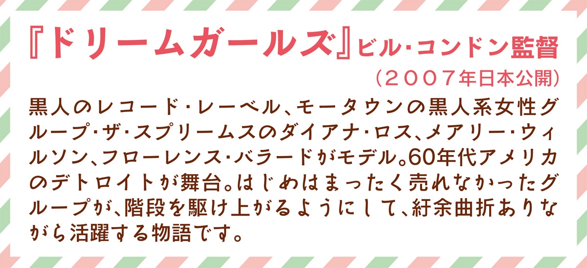 「小さいころからミュージカルが好きでした。親の影響かもしれません。映画のジャンルとしてもミュージカルが好きで、今回はビル・コンドン監督の『ドリームガールズ』歌手のビヨンセが出演したことでも話題になった作品です。私は公開当時、六本木の映画館で本作を観たのですが、なんと周りがスタンディングオベーション。とても高揚感がありました。細かい部分で好きなところはいくつもあるのですが、やはり一番はエフィ(ジェニファー・ハドソン)が終盤熱唱する場面。ほとんど怒鳴っているのにも近いその歌声はとても力強く、自分に響いてきました。本作では『強い女性』が描かれています。ストーリーもくっきりとしていて、いい意味で『分かりやすい』。3人が努力の末、成功するサクセスストーリーなので、いまなにかに挫けそうな女性にオススメです!」