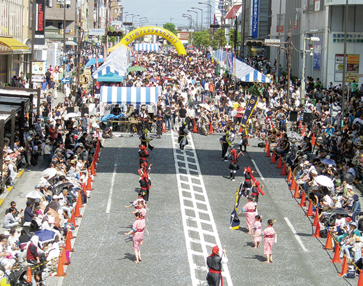 町田の中心市街地が躍動する2日間――町田エイサー祭りとも呼ばれる「第32回フェスタまちだ2018〜東日本復興支援 とどけよう 町田の力〜」が9月8日(土)、9日(日)、原町田大通りなどを会場に開催される。地元をはじめ、全国から参加する19団体が太鼓の力強い音に合わせて勇壮な演舞を繰り広げ、街中を沖縄色に染める。