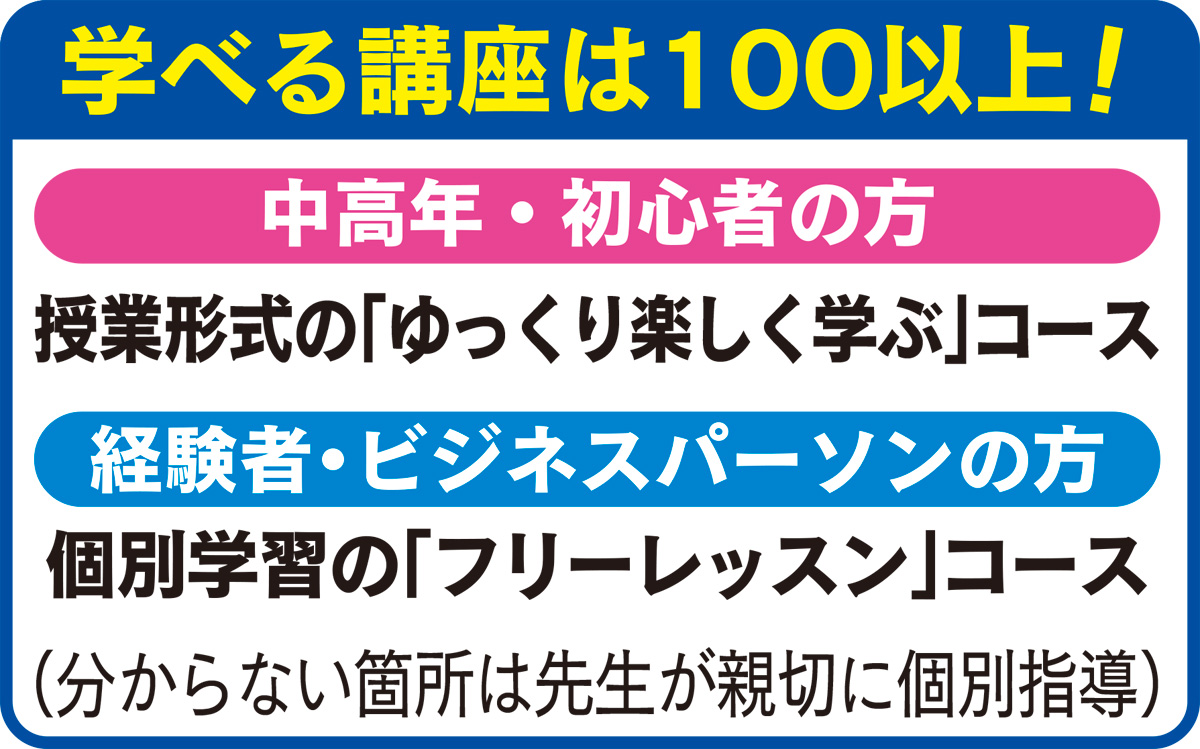 120人の同世代の仲間が楽しく学んでおり、平均年齢67才、最高齢は92歳のKさん。「1人で勉強するのではなく、先生が、くりかえし・ゆっくり・丁寧に授業形式で教えてくれるので大満足」という声が多い。講座種類も豊富だ。