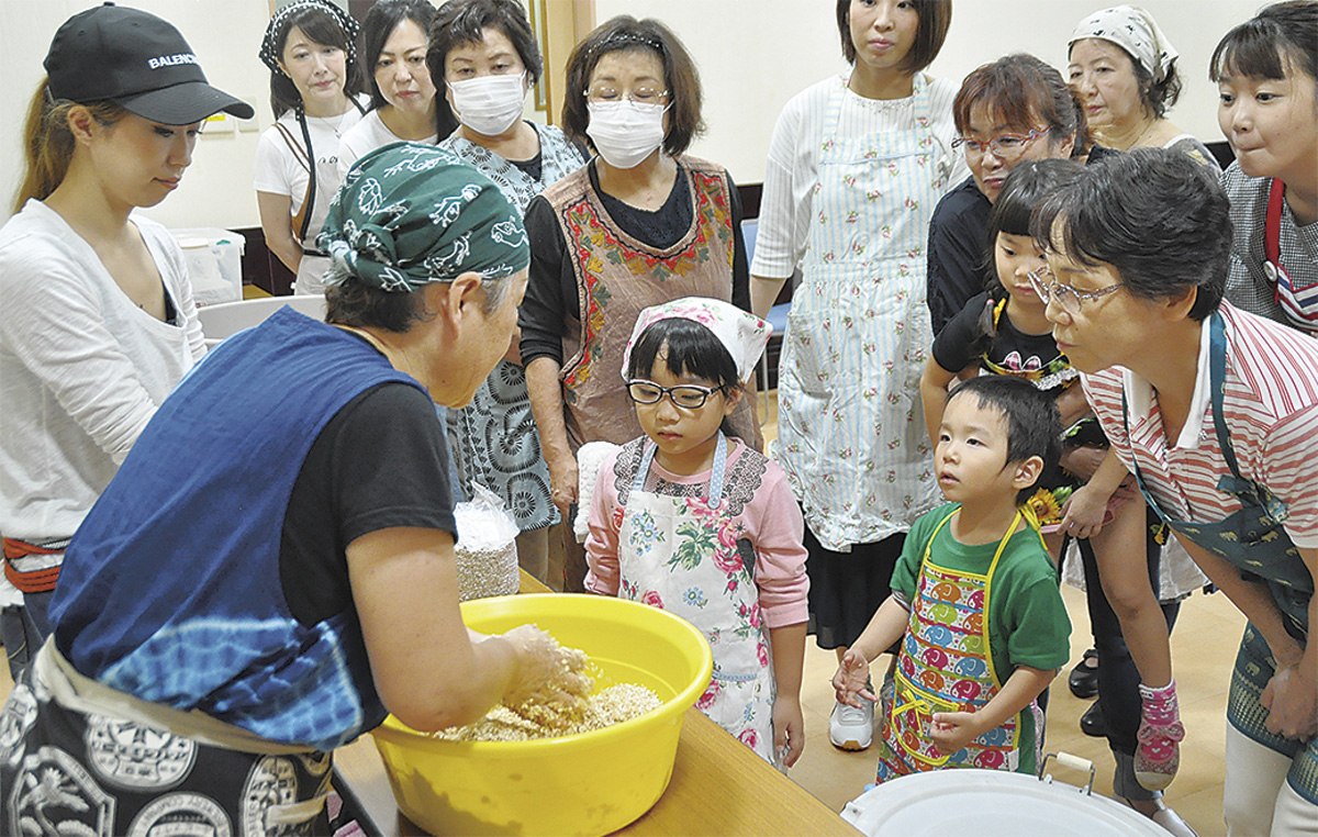 「孫たちの『食育』になれば」と話す祖母と一緒に参加した小学4年と2年の姉妹は「大豆をこねるのが泥遊びみたいで面白かった。お味噌汁が好きなので、自分のお味噌ができるのが楽しみ」と感想を述べていた。